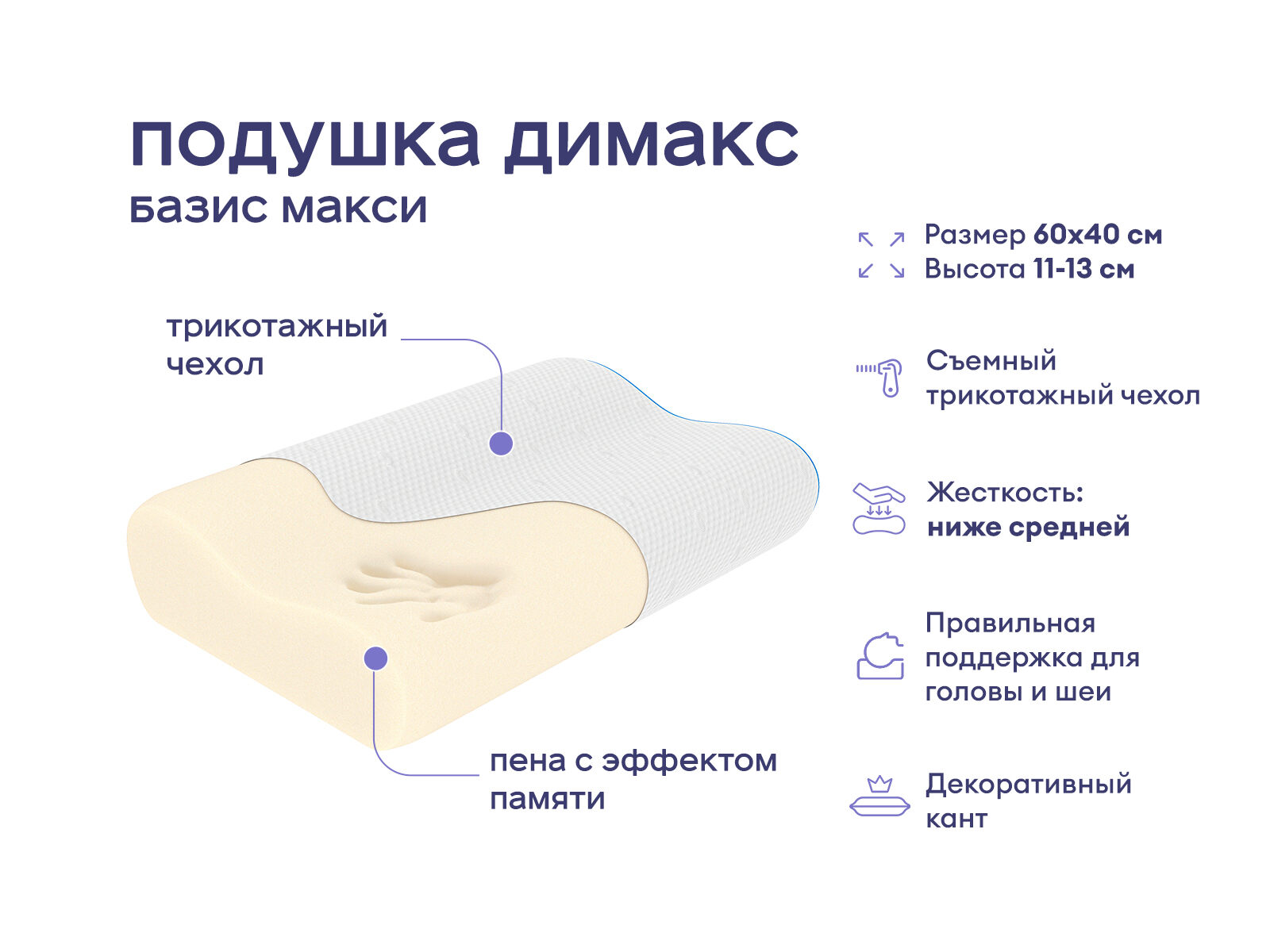 Мягкая анатомическая подушка классической формы. Модель универсальна и подойдёт для любой кровати и спальни. Наполнителем выступает инновационная пена мемори, которая запоминает линии тела. Это свойство позволяет подушке очень точно адаптироваться под любые особенности анатомии, делая сон очень комфортным. Модель бережно поддержит голову и шею в анатомически правильном положении. Подушка рассчитана на отдых в любой позе – сон на спине, животе или боку будет одинаково уютным.
