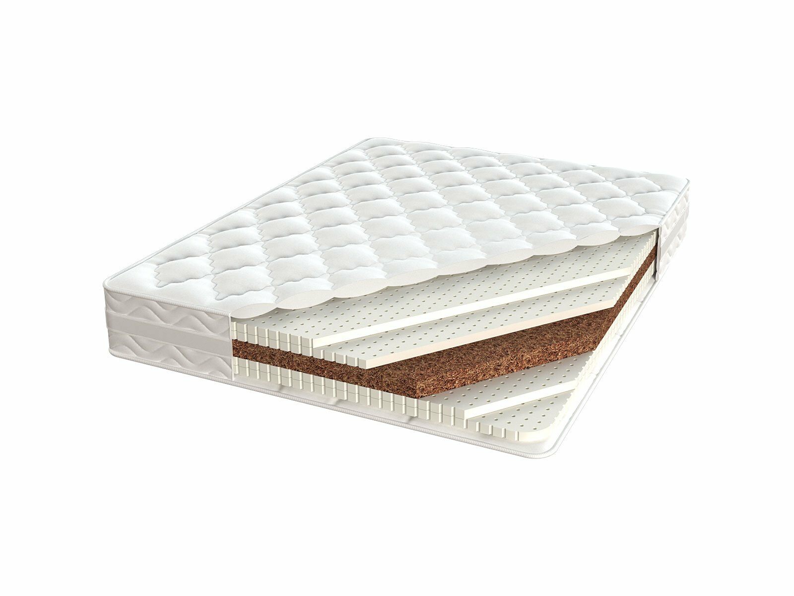 Наполнитель этого изделия представляет собой аналог слоёного пирога, в котором между натуральным латексом установлена прокладка из кокосовой койры, выполняющая функцию упругого пружинного блока.