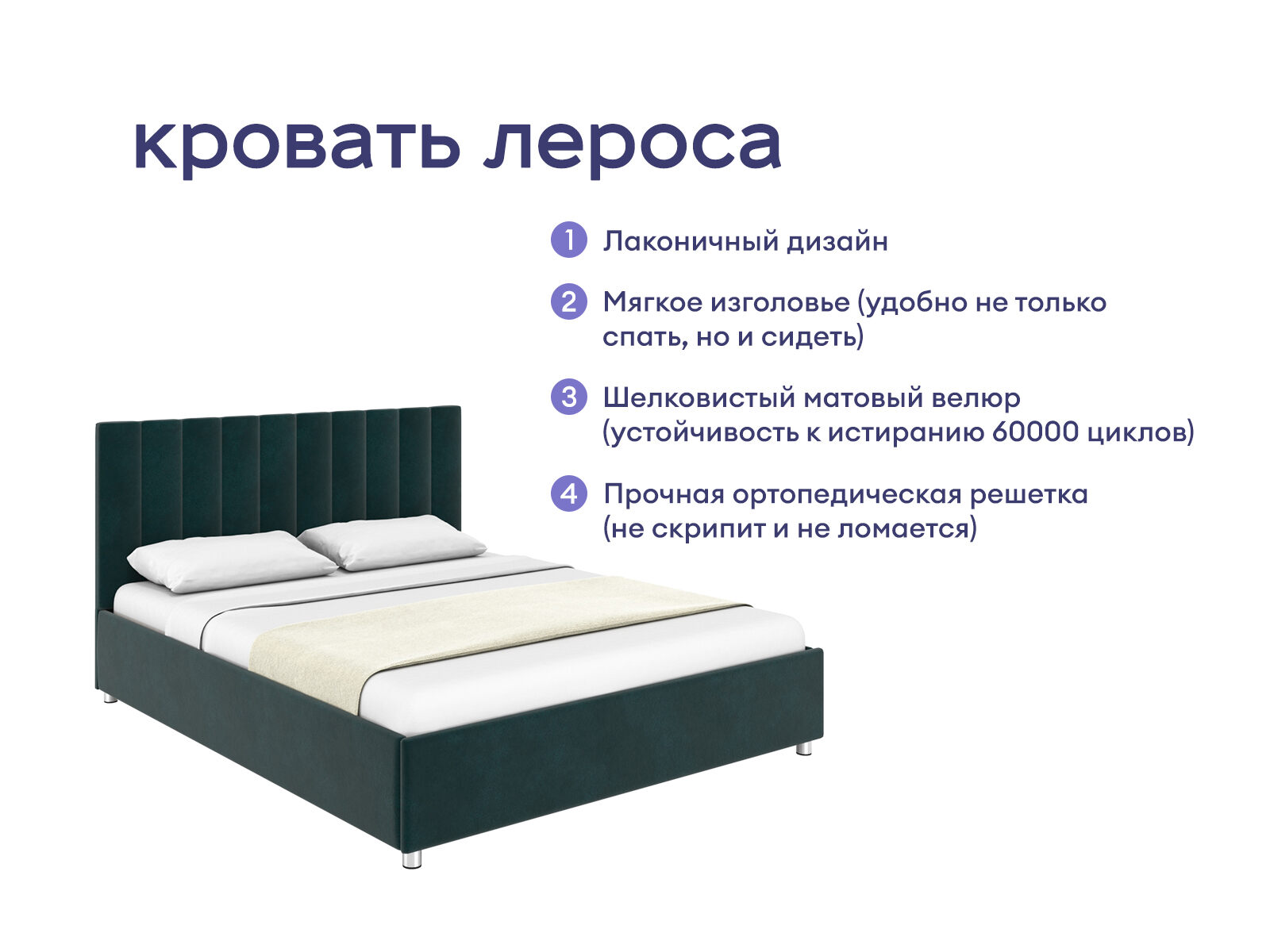 Модель отличается лаконичным изголовьем, которое украшает вертикальная параллельная стёжка. Стильная модель выделяется продуманным дизайном и украсит любой интерьер. Обивка кровати изготовлена из мягкого велюра. Короб производится из ДСП. В комплект входит ортопедическое металлическое разборное основание.