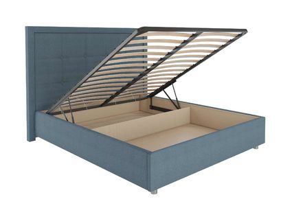 Кровать комплектуется металлическим основанием с подъемным механизмом, под которым находится вместительный бельевой ящик для хранения сезонных вещей и постельных принадлежностей.