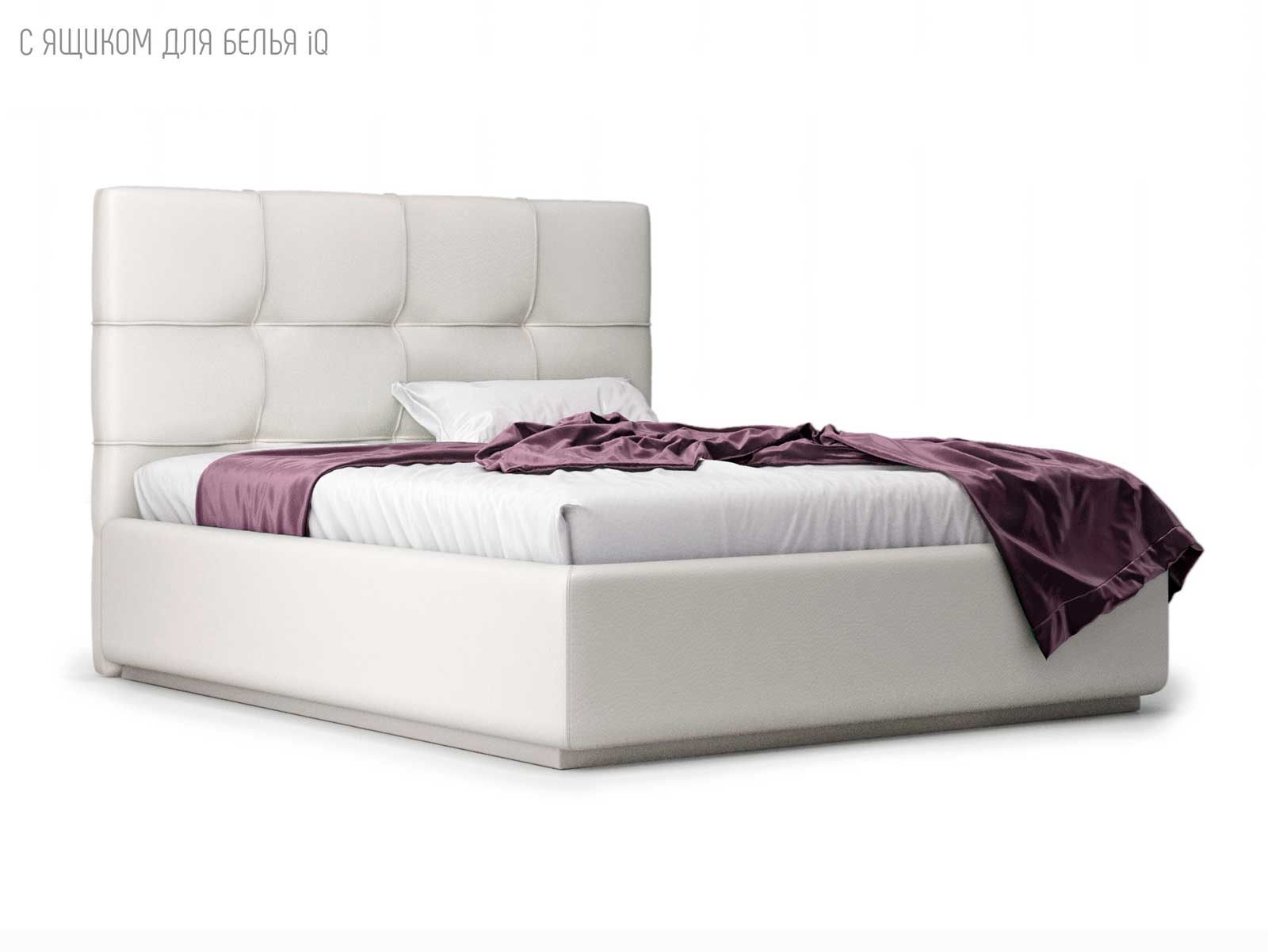 Кровать укомплектована IQ с подъемным механизмом и ящиком для белья без дна (дополнительная платная опция - дно к ящику IQ из HDF (ХДФ). Каркас кровати на цоколе, декоративный чехол на цоколе съёмный. Глубина ящика для белья - 30 см, без ограничения нагрузки на ящик.