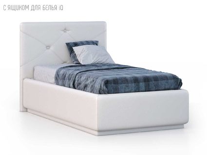 Кровать укомплектована IQ с подъемным механизмом и ящиком для белья без дна (дополнительная платная опция - дно к ящику IQ из HDF (ХДФ). Каркас кровати на цоколе, декоративный чехол на цоколе съёмный. Глубина ящика для белья - 30 см, без ограничения нагрузки на ящик.