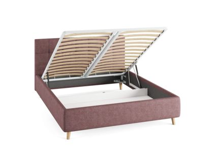 Двуспальная кровать с мягким изголовьем подойдет для современных интерьеров спален, а благодаря высоким деревянным ножкам впишется в стиль ретро, скандинавский или минимализм.