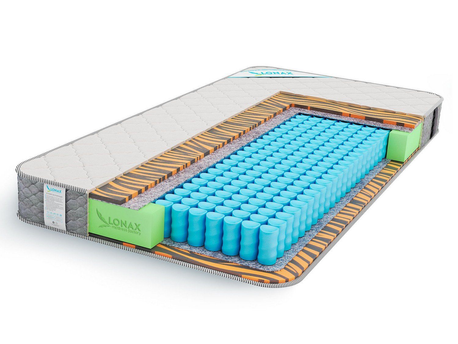 С обеих сторон от блока расположены слои материала «Tiger Memory», обладающего необычной структурой, повышающей его анатомические свойства. Tiger Memory лучше подстраивается под форму тела и "запоминает" ее на более долгий срок.