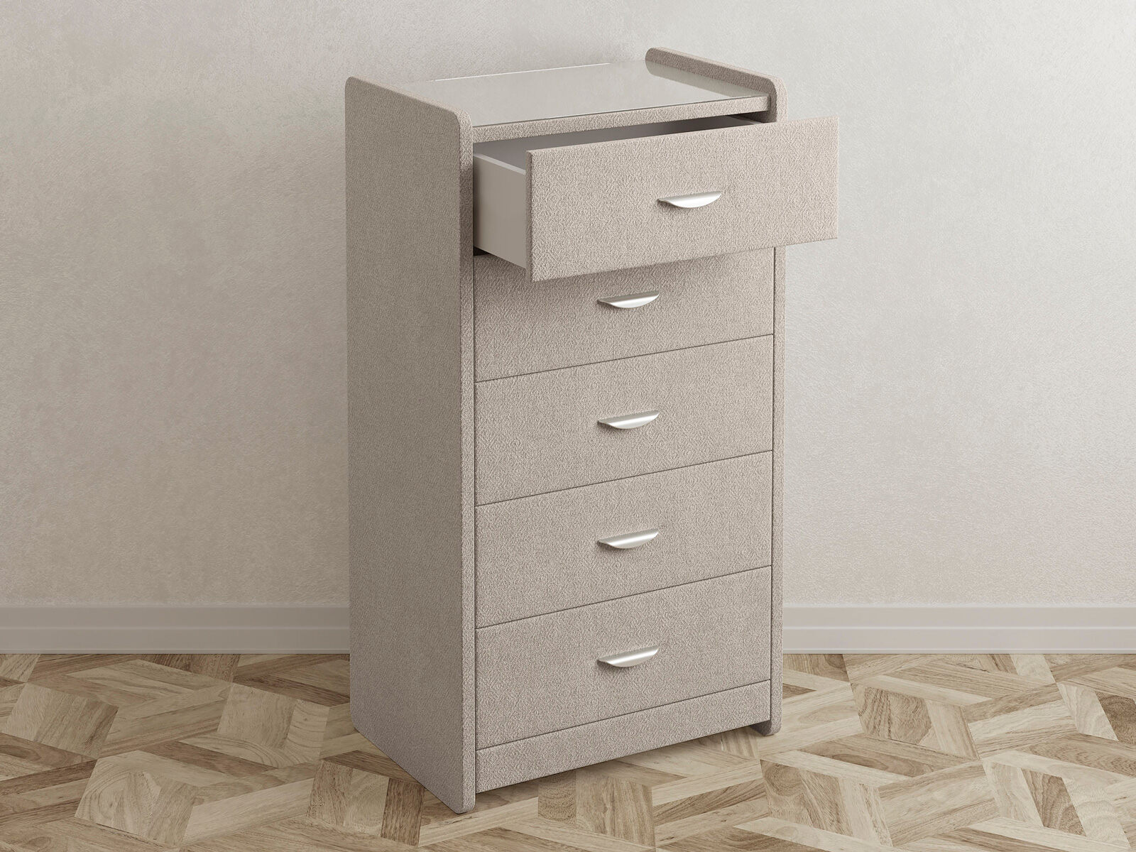 Комод с 5 ящиками сдержанного дизайна дополнит любой интерьер и сделает его более функциональным. Каркас комода и фасад ящиков покрыты обивочным материалом и выполняется в 43 вариантах цветового исполнения. Для удобства использования и продления срока эксплуатации, рекомендуется использовать стеклянную накладку. Накладка используется в качестве столешницы для тумбы и защищает ее от повреждений и загрязнений. Стеклянная столешница заказывается дополнительно.