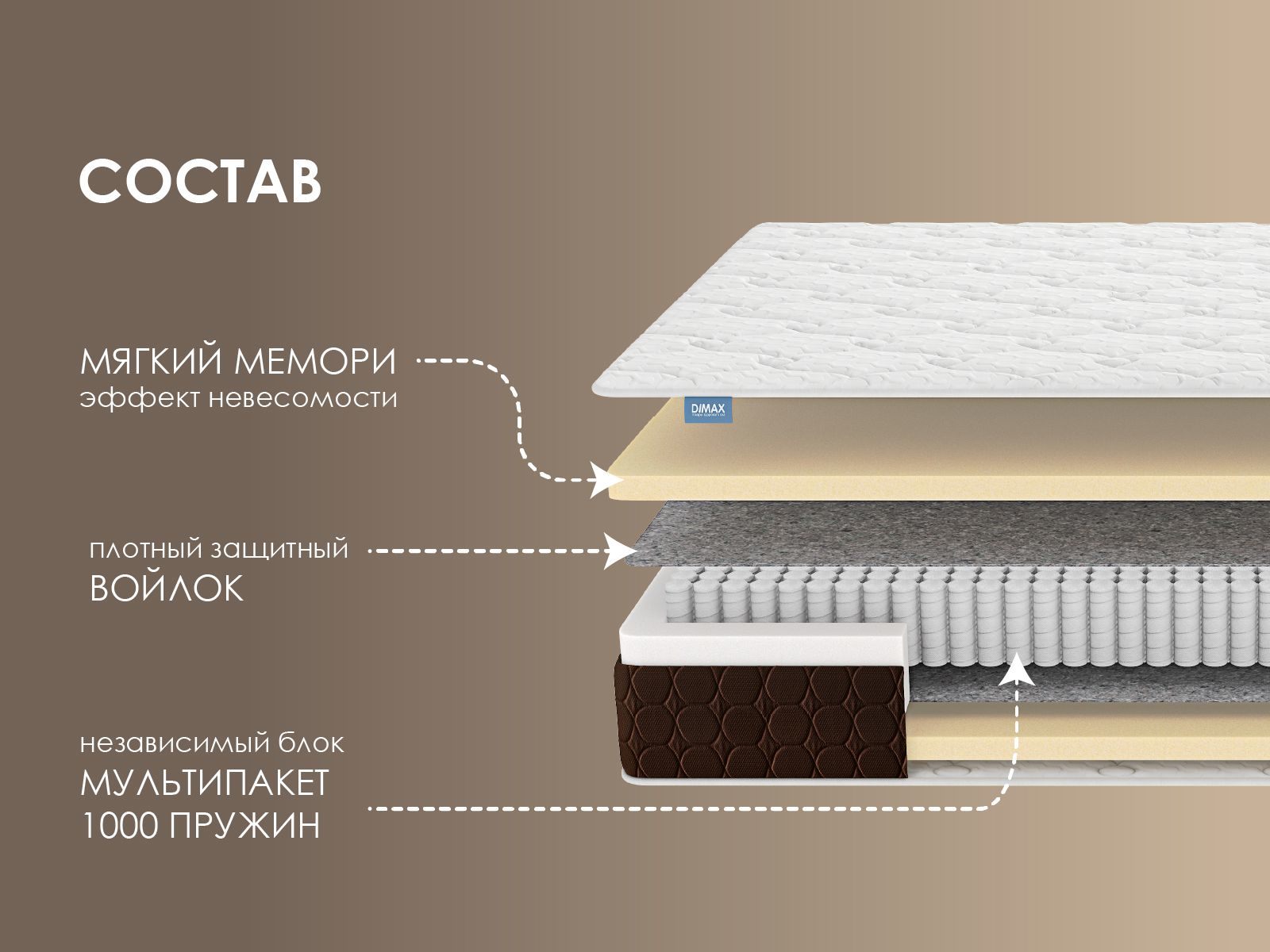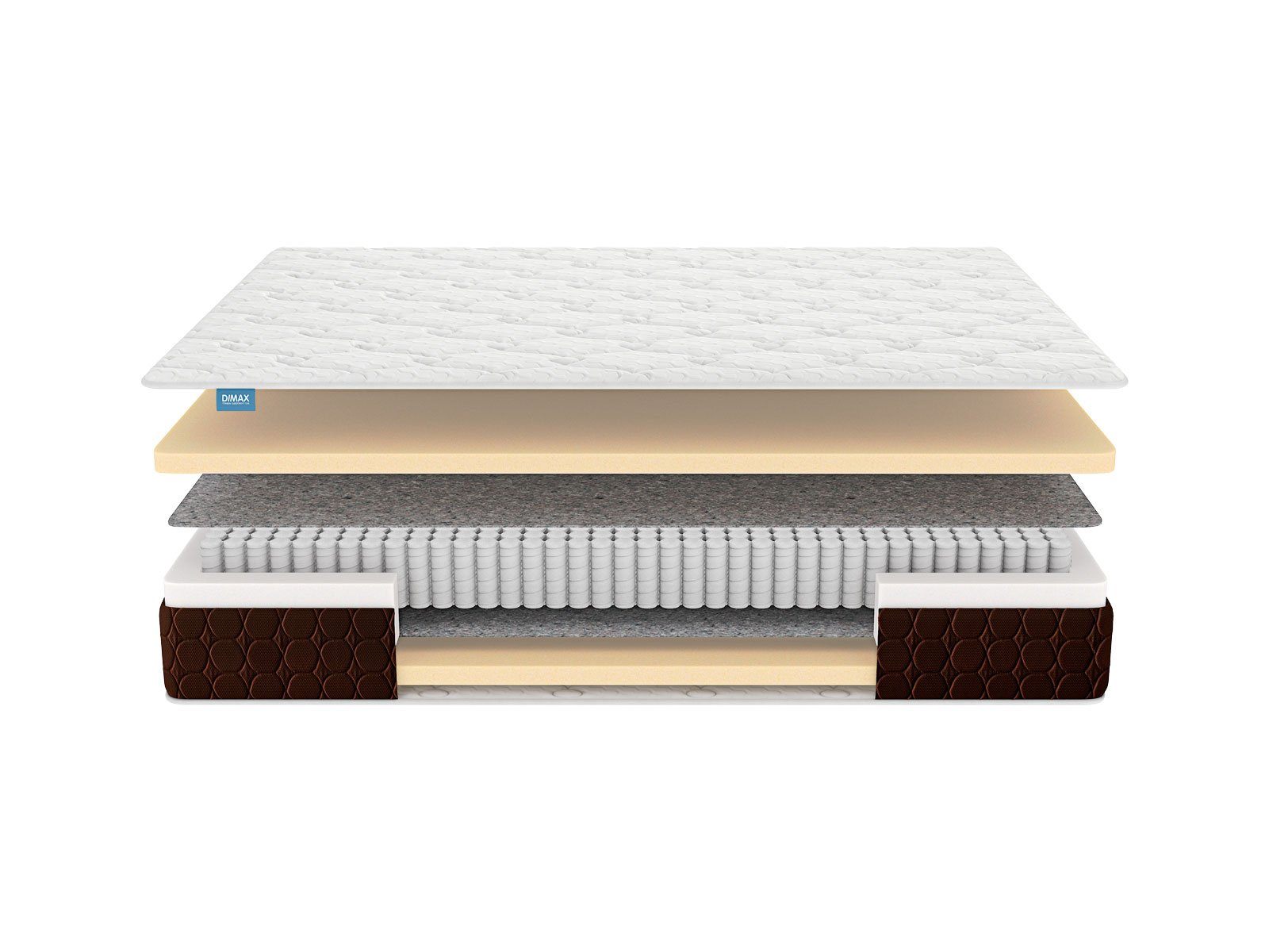 Боковая сторона изготовлена из мебельной ткани богатого темно-коричневого цвета, простеганной на ППУ. Этот материал обладает повышенной износостойкостью, поэтому усиливает прочность матраса.
