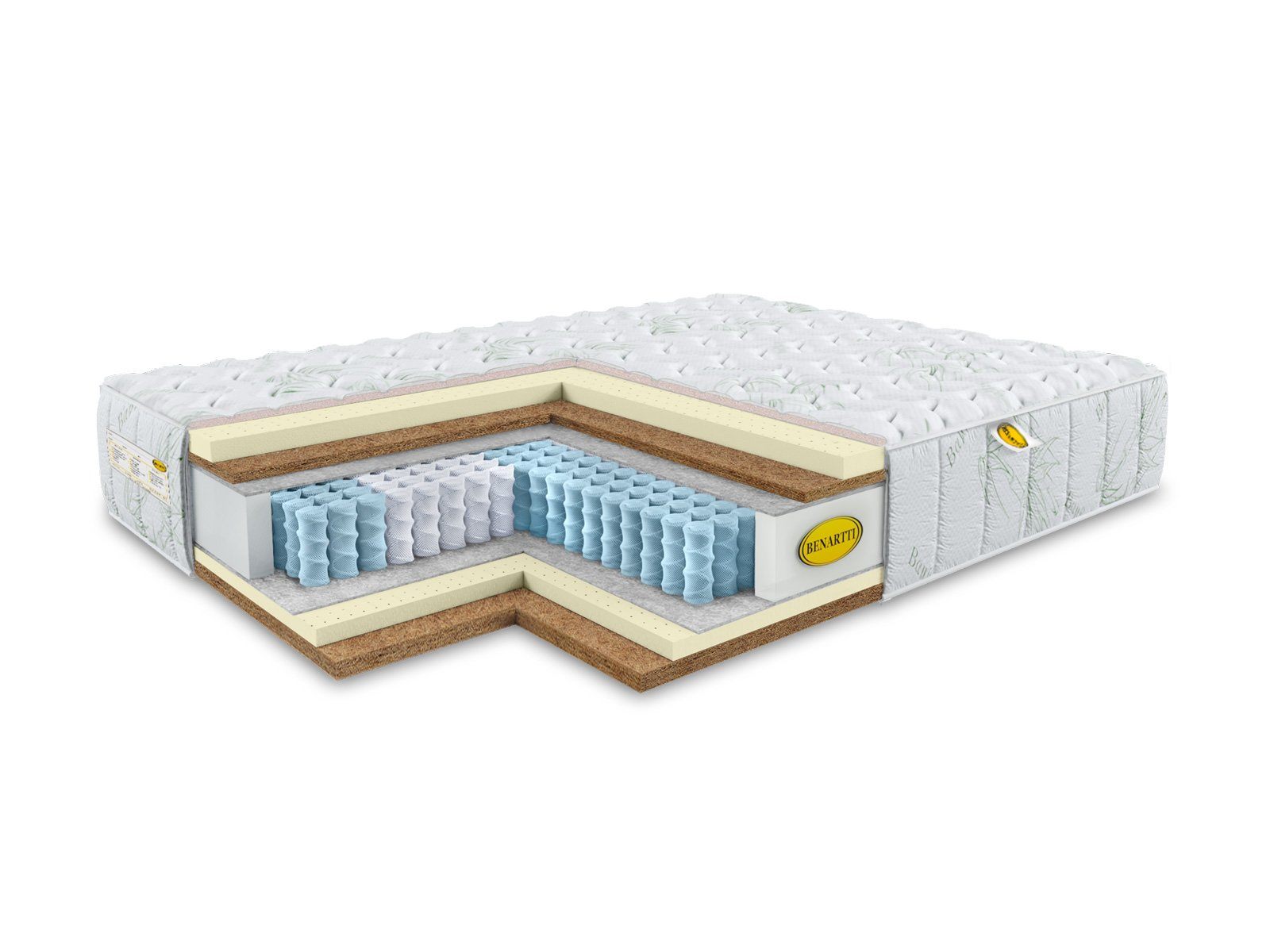 Общая высота в 29 см складывается не только благодаря пружинному блоку. Здесь также задействованы слои натуральной кококосовой койры и природного латекса, проложенные в различном порядке сразу с двух сторон. Так производитель реализовал различную жёсткость сторон – среднюю и выше среднего.
