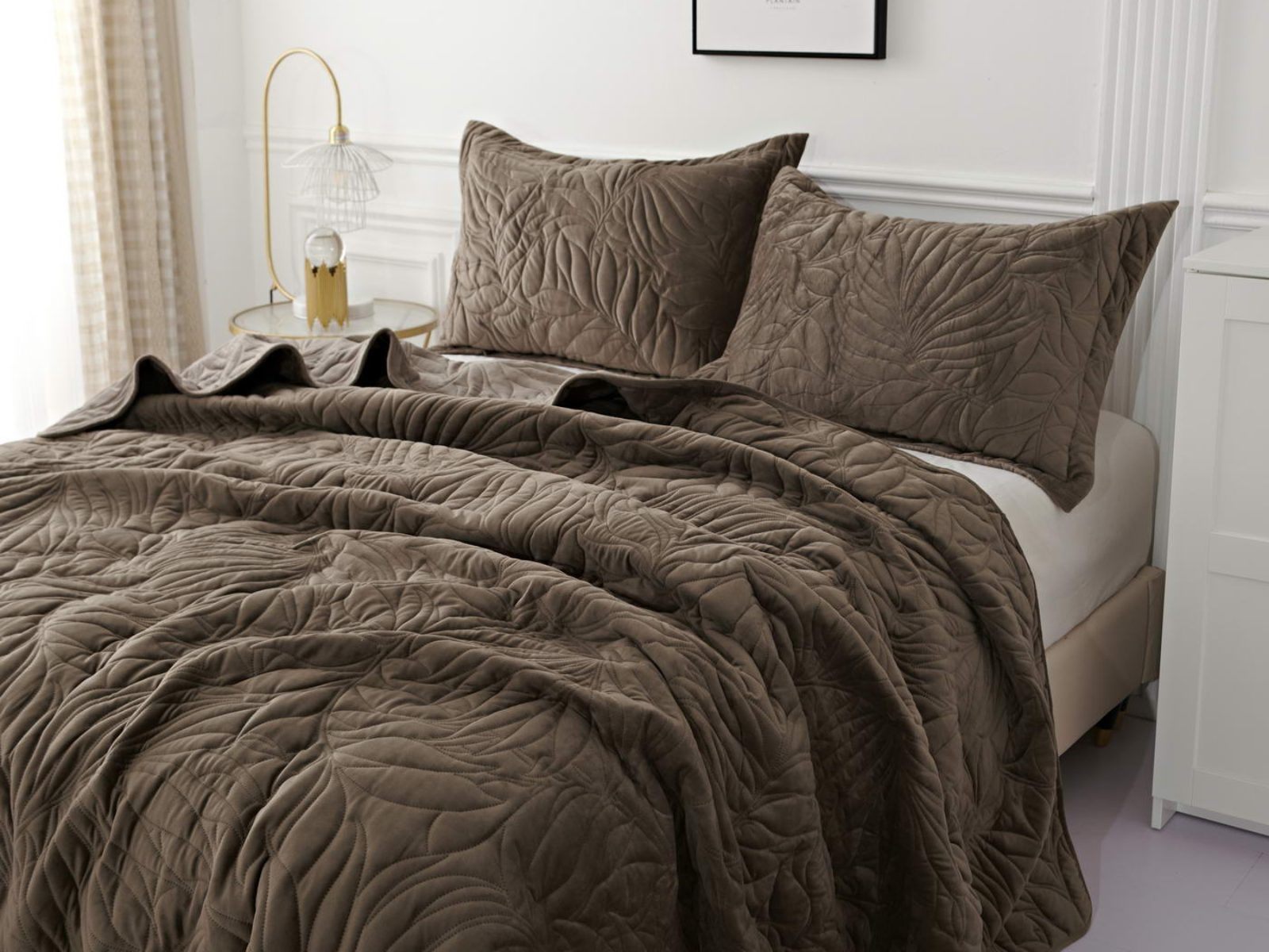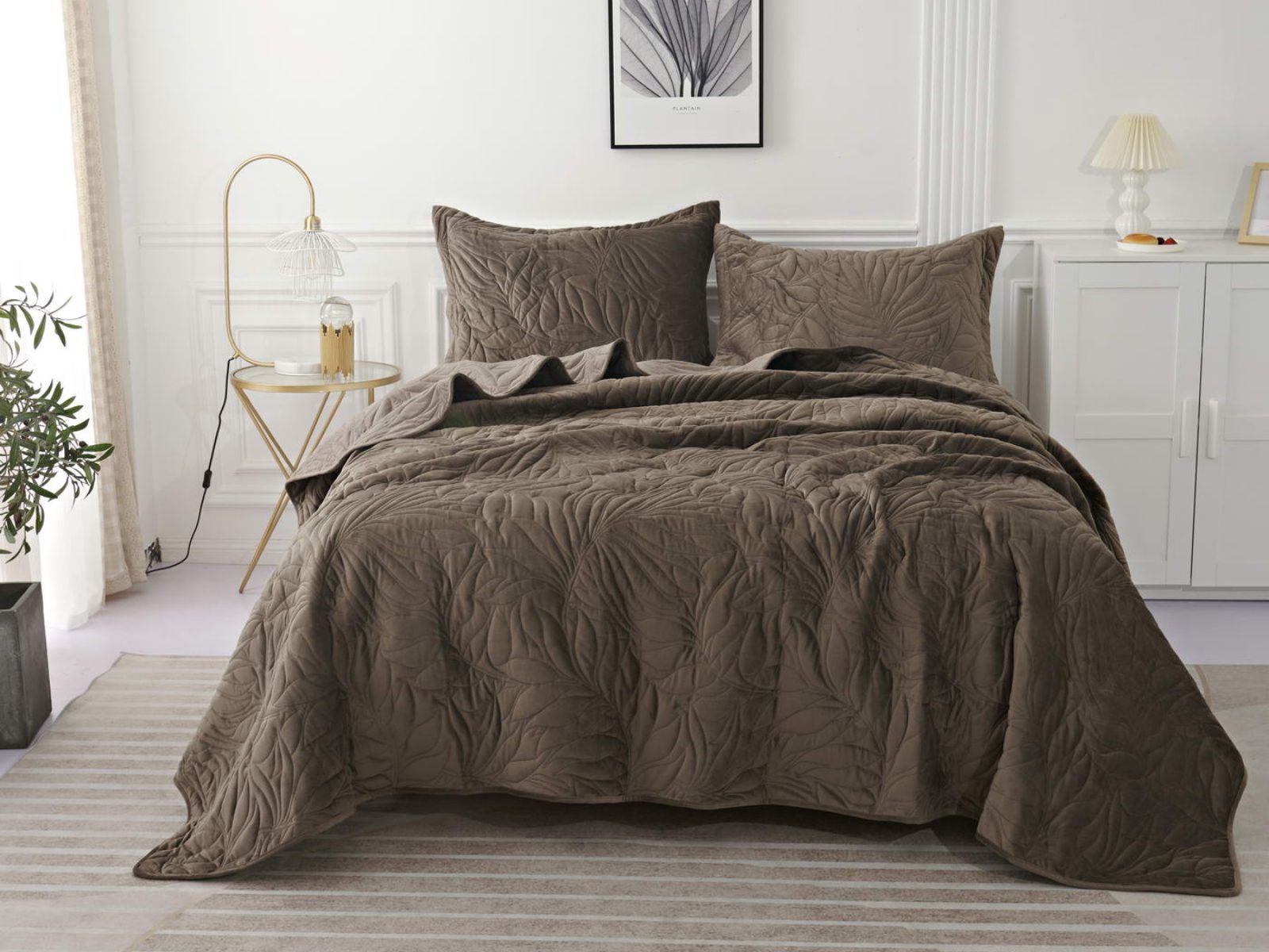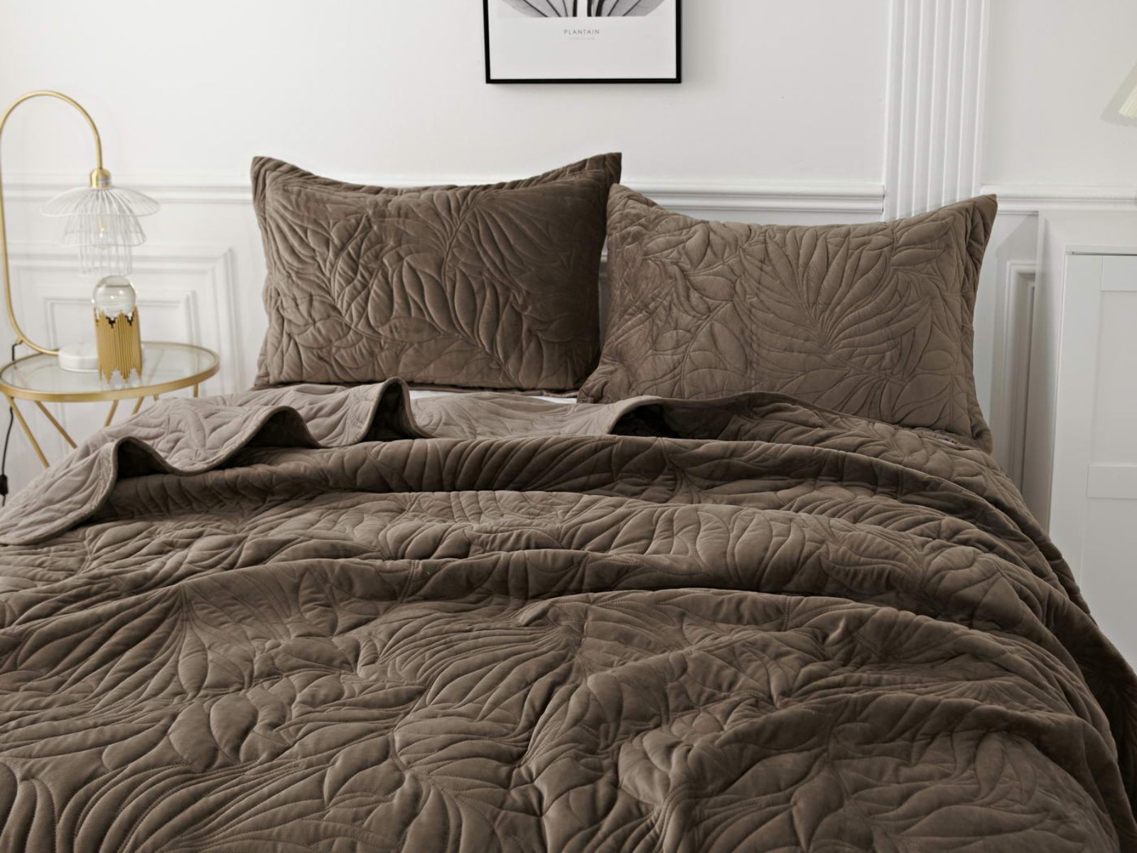 Стёганое покрывало Глория изготовлено из 100% вискозы, что делает его невероятно мягким и комфортным. Рисунок напоминает листья лавра. Такой орнамент подойдет большинству современных интерьеров.